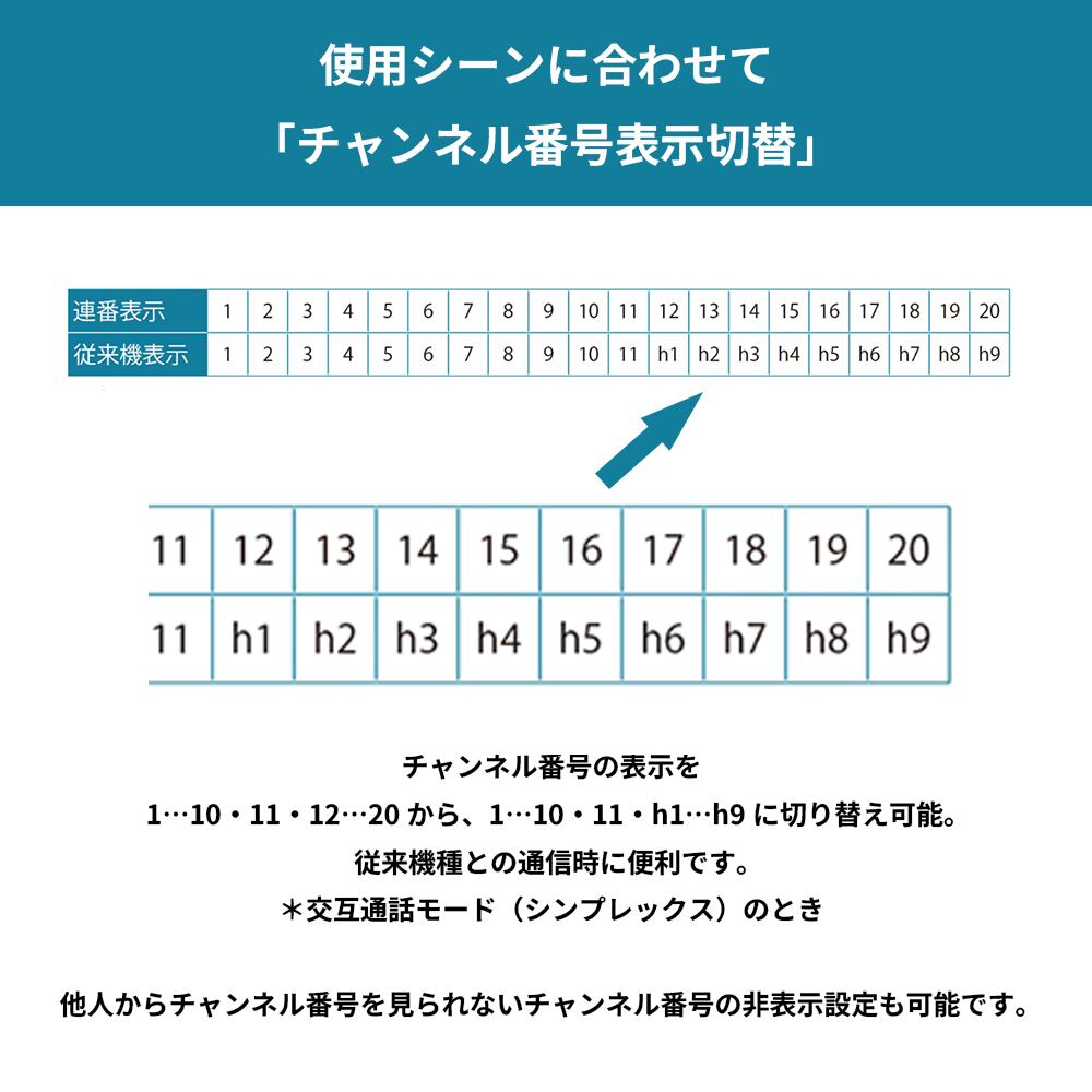 チャンネル番号の表示をCH1-20から、従来表示であるCH1-11、CH-h1-h9へと切り替えることが可能※3。本機と従来の“DEMITOSS”「UBZ」シリーズで通話する際に便利です。